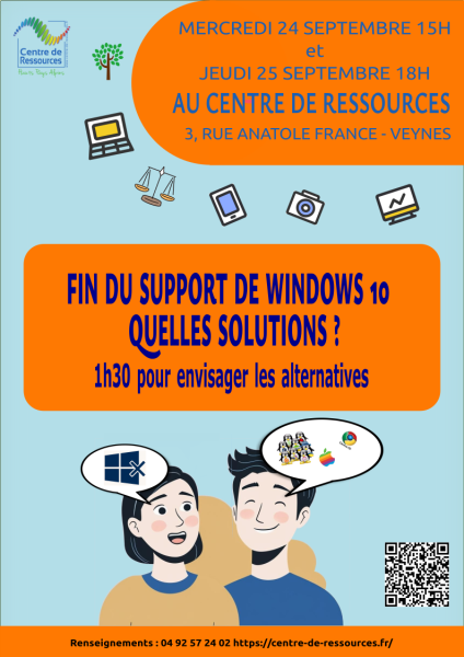 Le centre de ressources organise deux sessions d'information sur la fin du support de Windows 10 en octobre: une le mercredi 24 septembre à 15h et une le jeudi 25 septembre à 18h. Ces dates et heures ont été choisies pour que ce soit accessible au plus grand nombre. Il s'agit de voir ce que cela implique pour les utilisateurs et quelles sont les solutions qu'ils peuvent mettre en place. Je vous joins une affiche à diffuser largement si vous le voulez bien. N'hésitez pas à me contacter pour plus d'information si besoin.